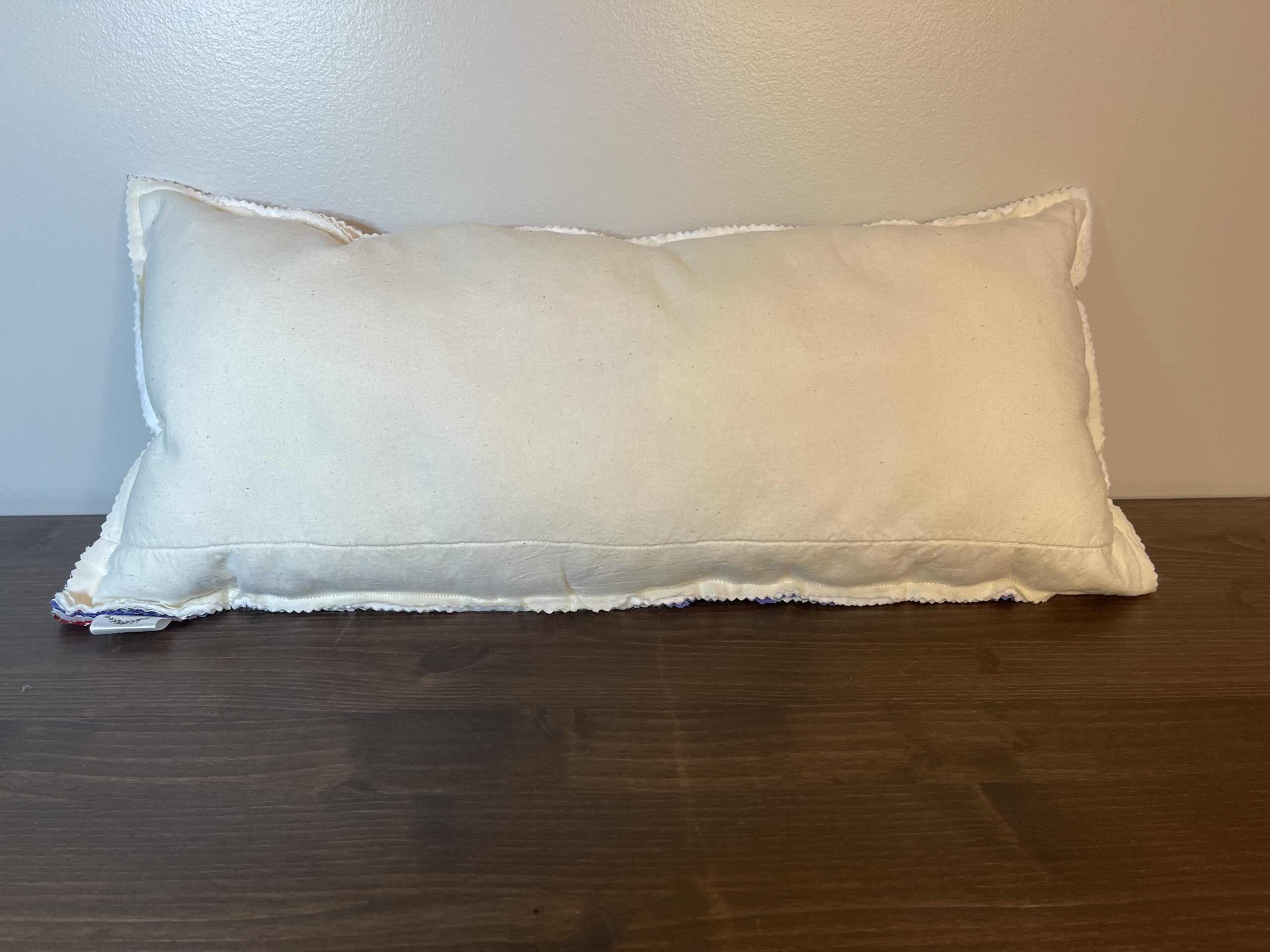 This lumbar-style pillow is crafted from a vintage log cabin quilt, showcasing the timeless beauty and structure of this classic quilt pattern. The back is finished in a soft cream vintage quilt fabric for a clean, neutral contrast.