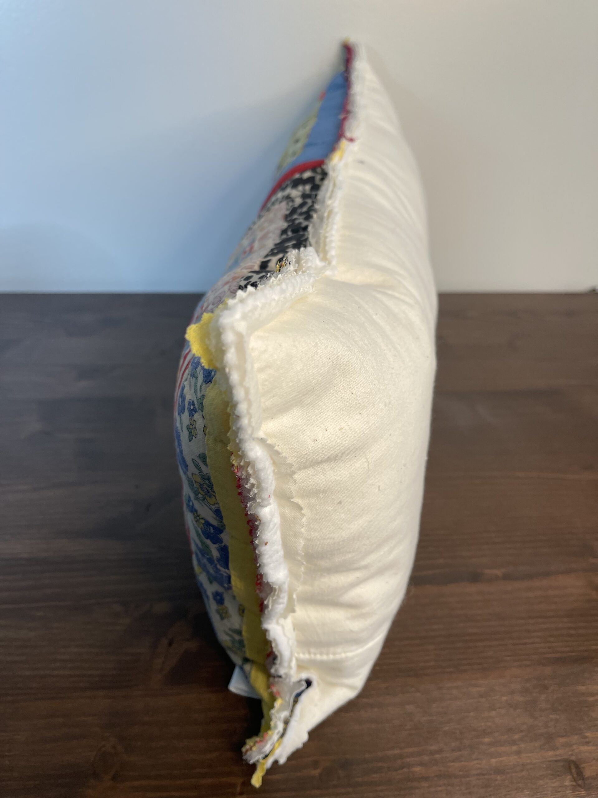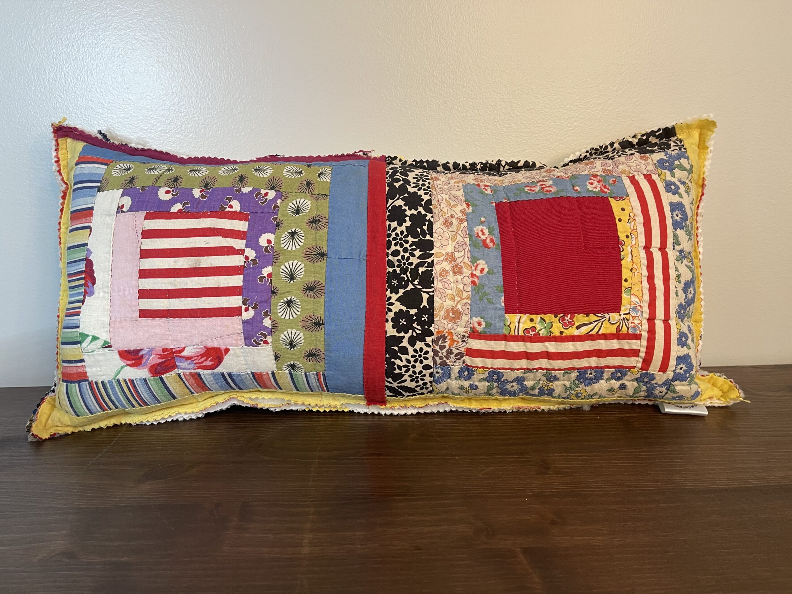 This lumbar-style pillow is crafted from a vintage log cabin quilt, showcasing the timeless beauty and structure of this classic quilt pattern. The back is finished in a soft cream vintage quilt fabric for a clean, neutral contrast.