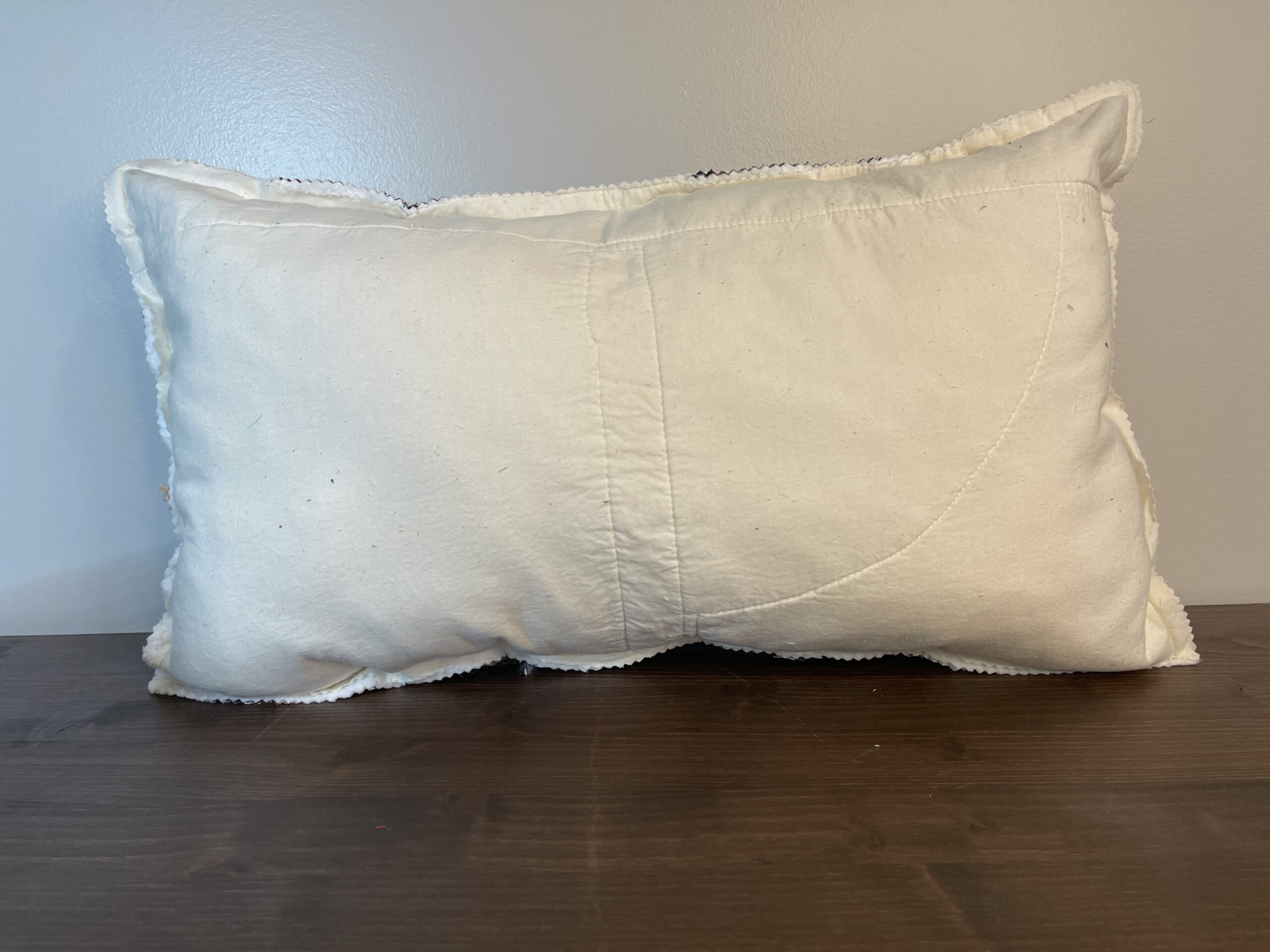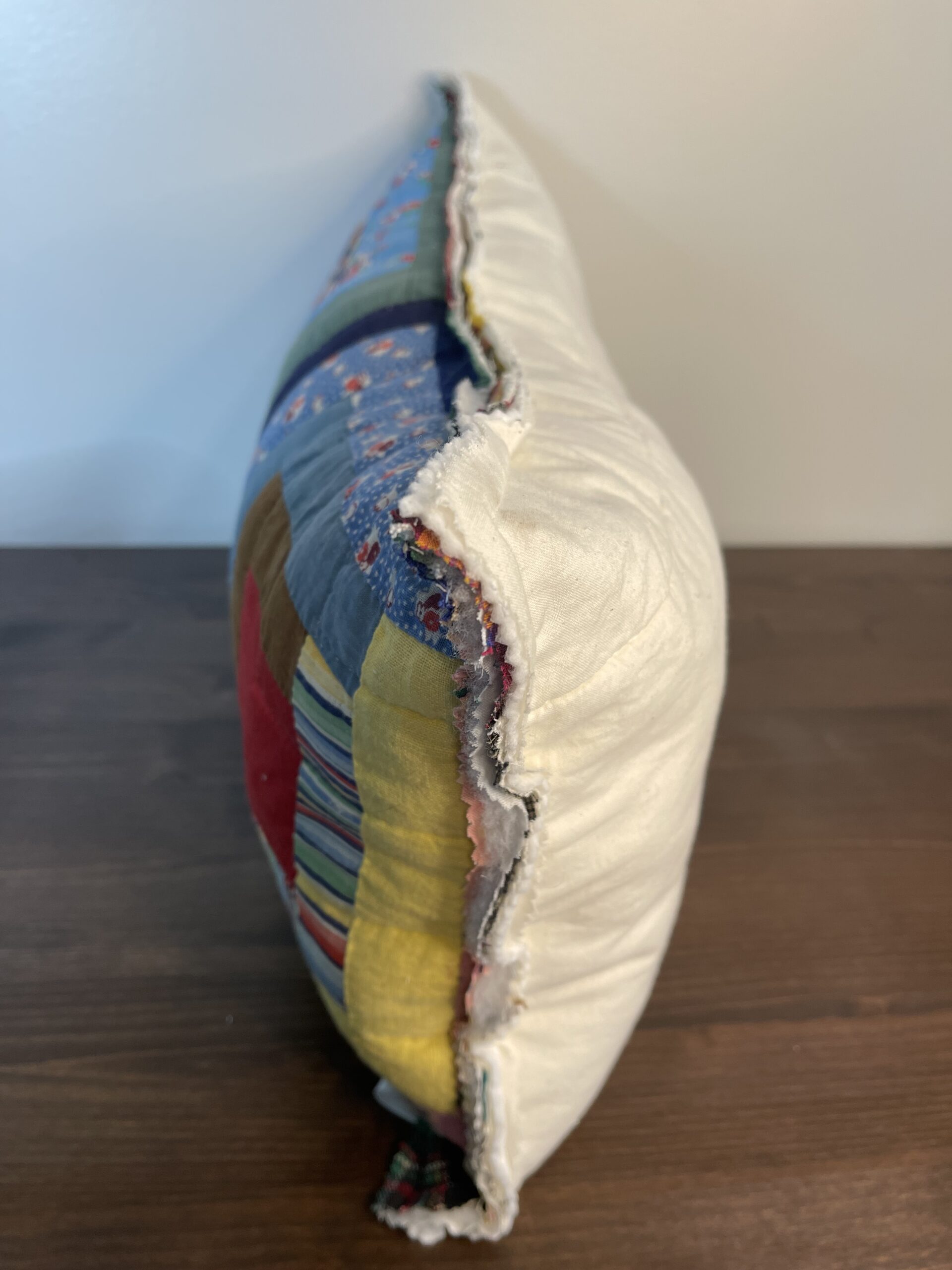This lumbar-style pillow is crafted from a vintage log cabin quilt, showcasing the timeless beauty and structure of this classic quilt pattern. The back is finished in a soft cream vintage quilt fabric for a clean, neutral contrast.