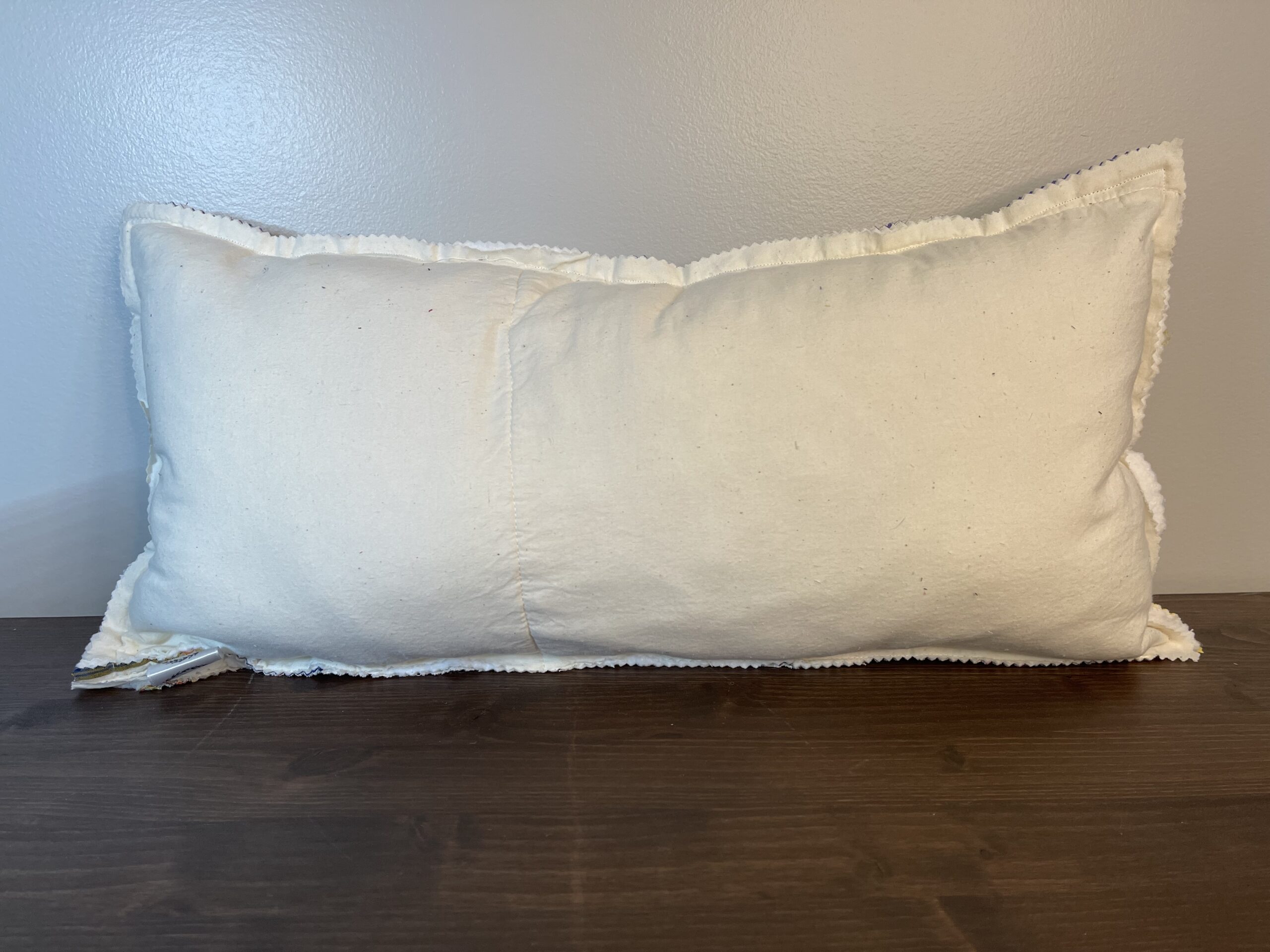 This lumbar-style pillow is crafted from a vintage log cabin quilt, showcasing the timeless beauty and structure of this classic quilt pattern. The back is finished in a soft cream vintage quilt fabric for a clean, neutral contrast.