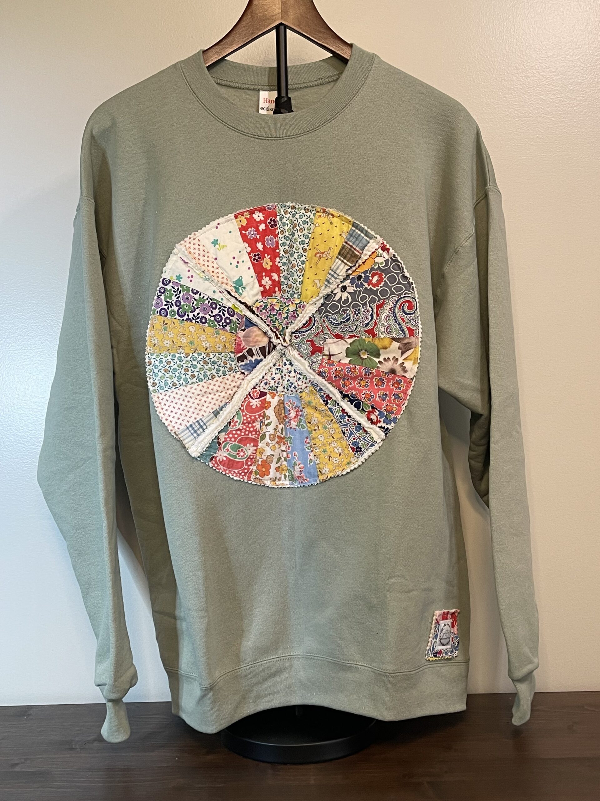 This stonewash green sweatshirt features a circular appliqué made from four vintage quilt fan blocks, creating a unique and eye-catching design.